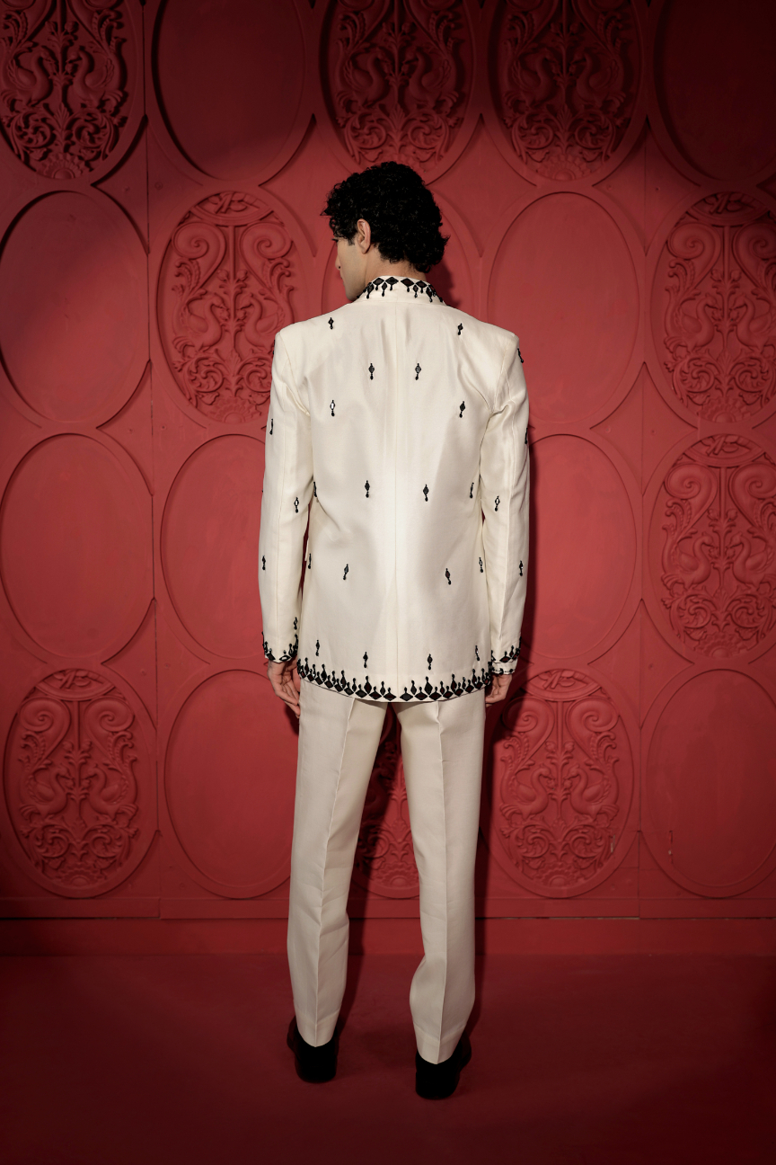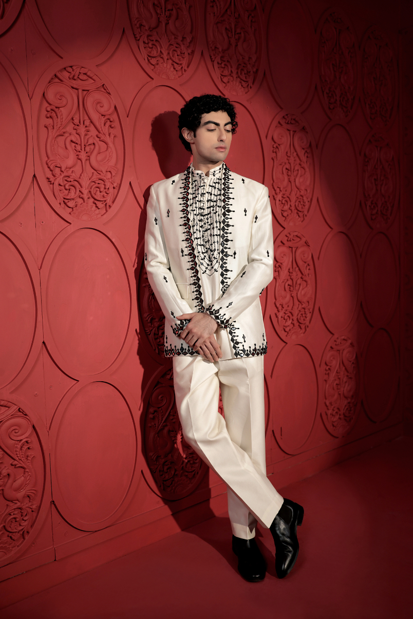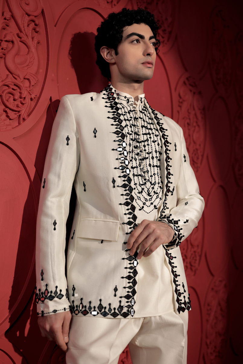 Silk Chanderi White Jacket Set Embroidered with Black Mirror Work and Paired with a Short Kurta and Pants