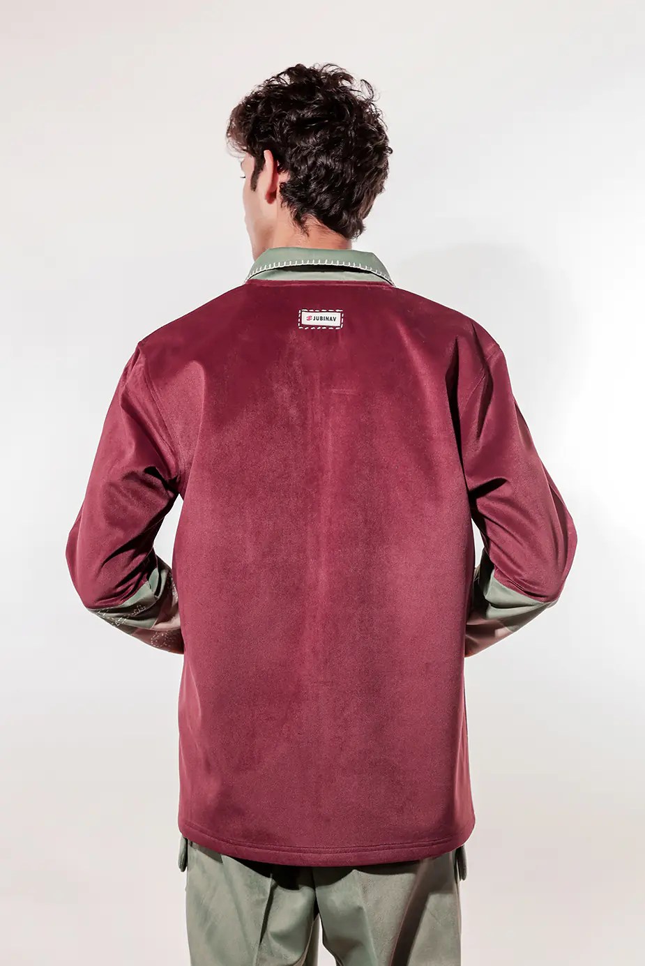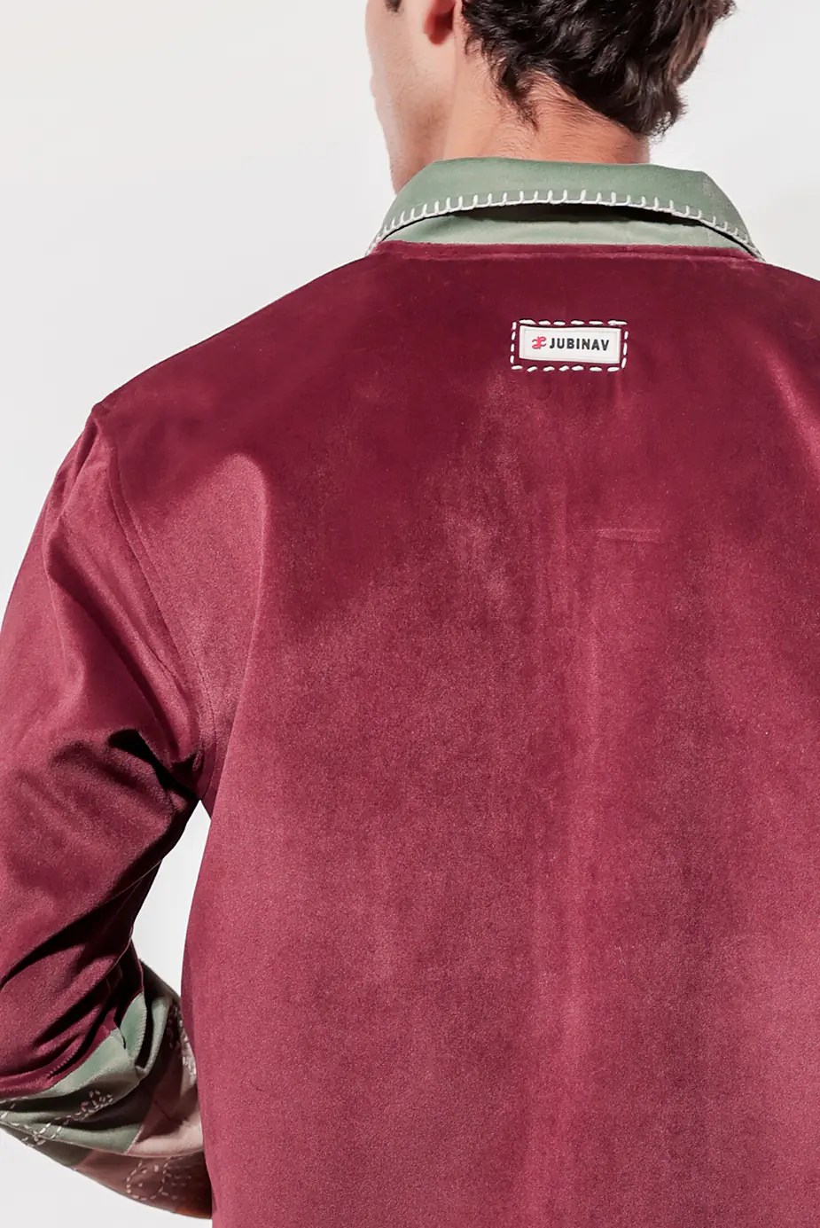 Maroon suede jacket with a green collar and colourful panels on the sleeves with white kantha embroidered doodles on one side of the jacket and the sleeves to add a creative, artistic touch.