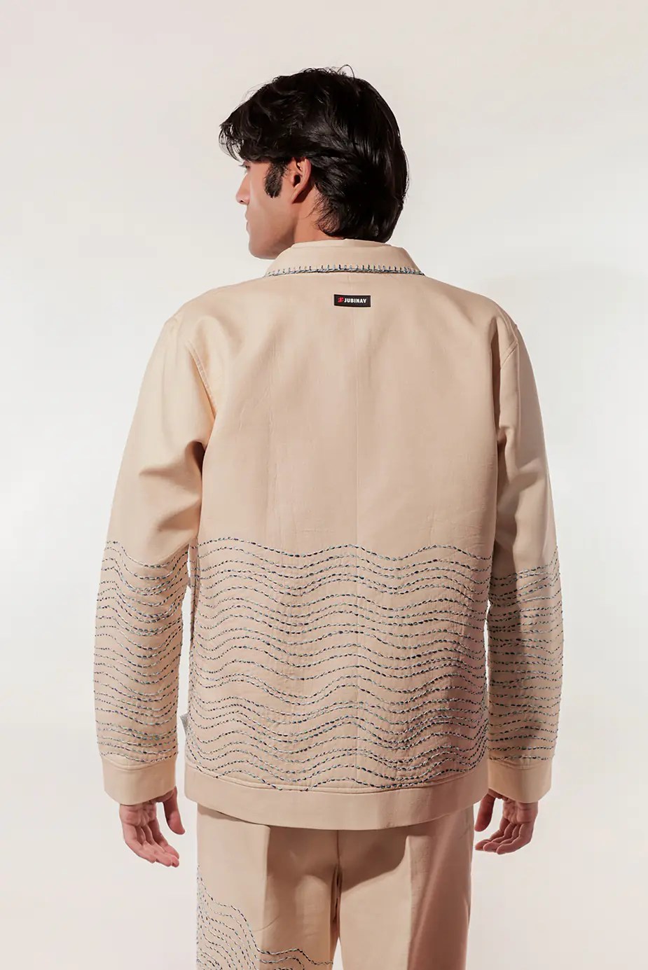 A cream jacket with detailed kantha embroidery depicting flowing water, with origami fabric boats. Designed to balance artistic detail with elegance, it reflects refined craftsmanship and modern style.