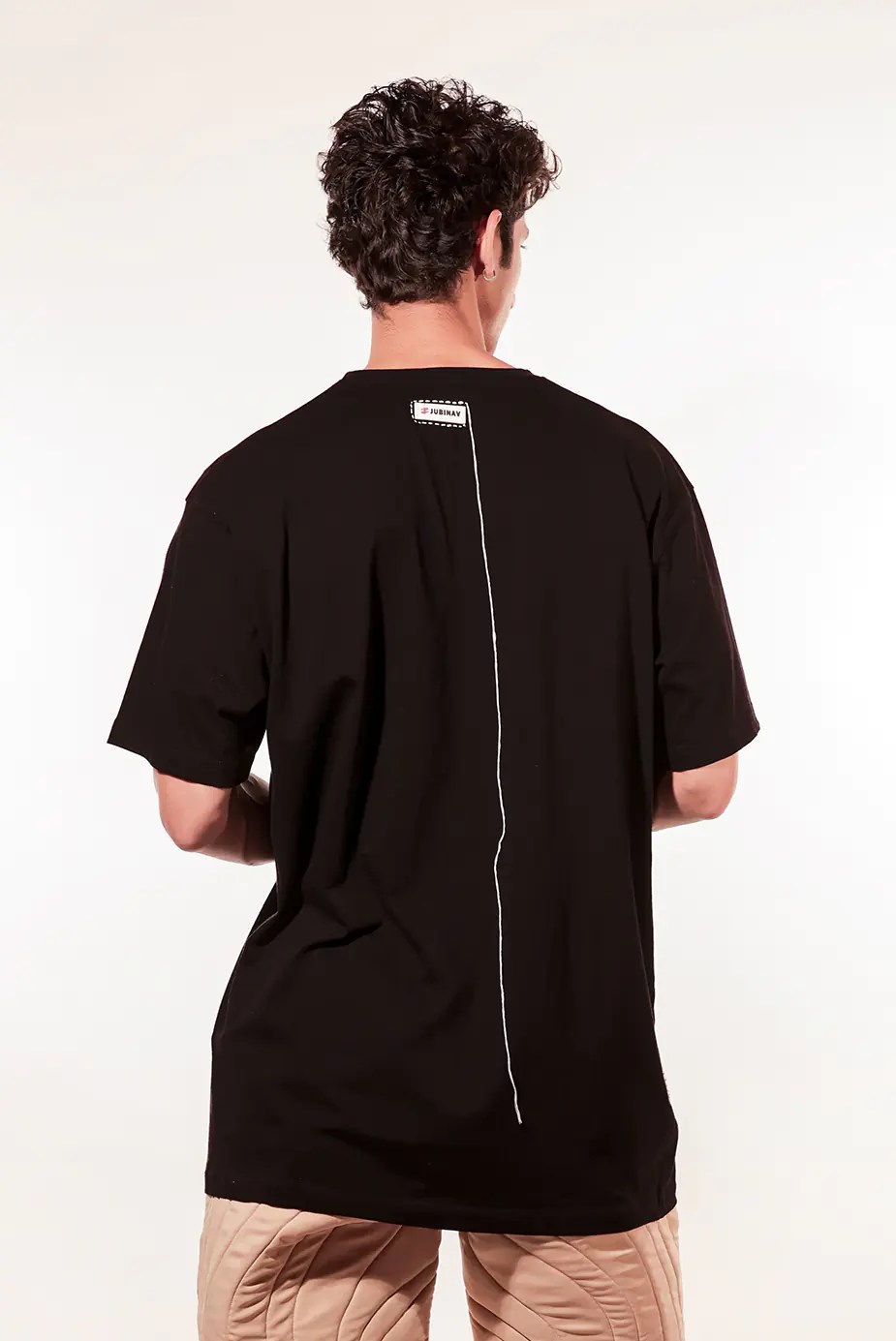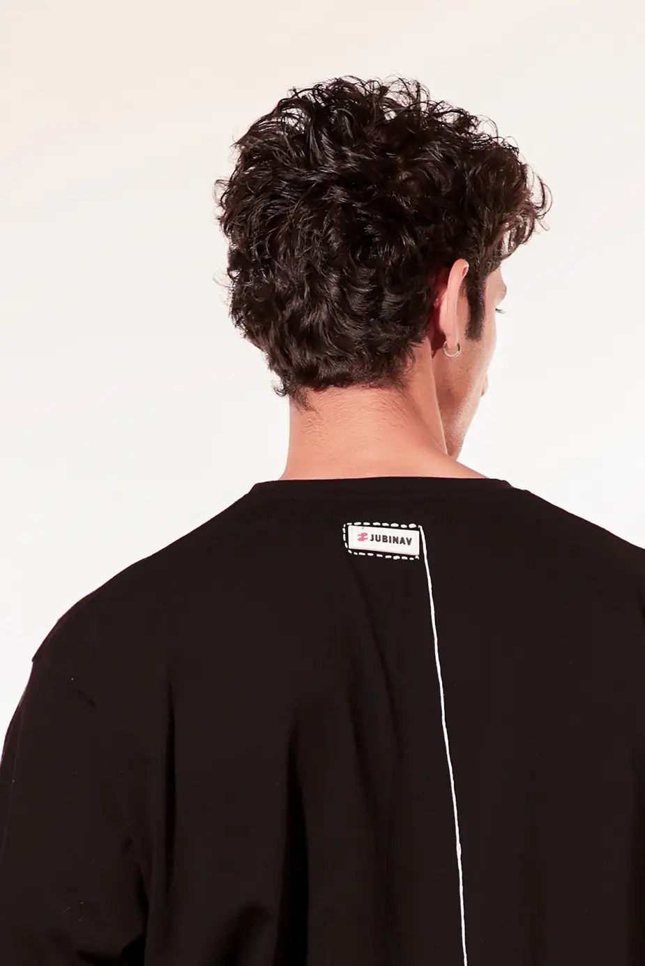 White Kantha hand-embroidered doodles features hanging thread on a black T-shirt, combining traditional craftsmanship with modern style.